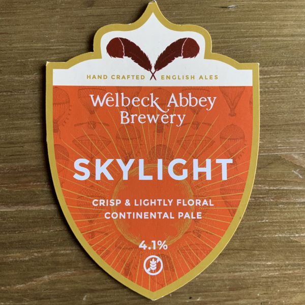 Beer: Skylight Brewery: Welbeck Abbey %ABV: 4.1% Description: Crisp & lightly floral continental pale Drink in/Takeaway Price per pint: £4/£3.25
