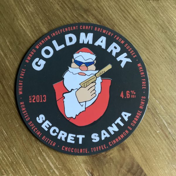 Beer: Secret Santa Brewery: Goldmark %ABV: 4.6% Description: Chocolate, toffee, cinnamon & orange hints Drink in/Takeaway Price per pint: £4/£3.25