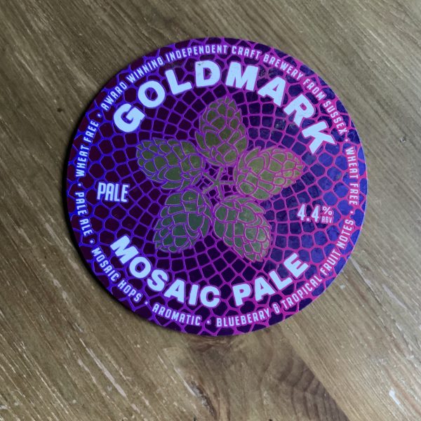 Beer: Mosaic Pale Brewery: Goldmark %ABV: 4.4% Description: Single hopped pale ale with blueberry, mango, and pine flavours. Drink in/Takeaway Price per pint: £4/£3.25