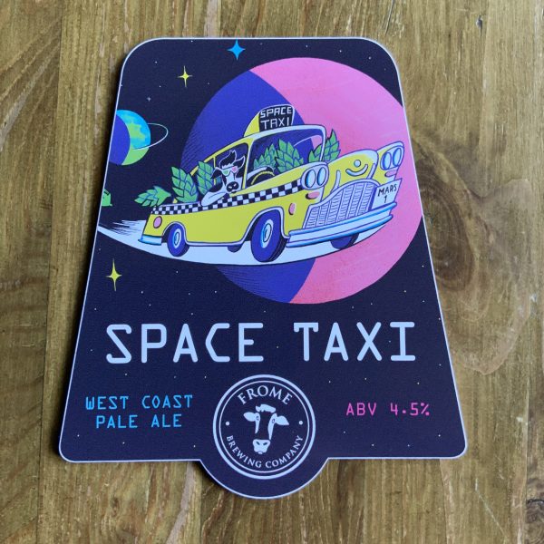 Beer: Space Taxi Brewery: Frome %ABV: 4.5% Description: West Coast Pale Ale Berry, Stone fruit and tropical flavours. Hops Simcoe, Amarillo & Eukanot Drink in/Takeaway Price per pint: £4