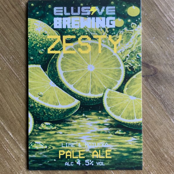Beer: Zesty Brewery: Elusive %ABV: 4.5% Description: Lime & Motueka pale ale Drink in/Takeaway Price per pint: £4/£3.25