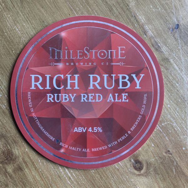 Beer: Rich Ruby Brewery: Milestone %ABV: 4.5% Description: Ruby red ale Drink in/Takeaway Price per pint: £4